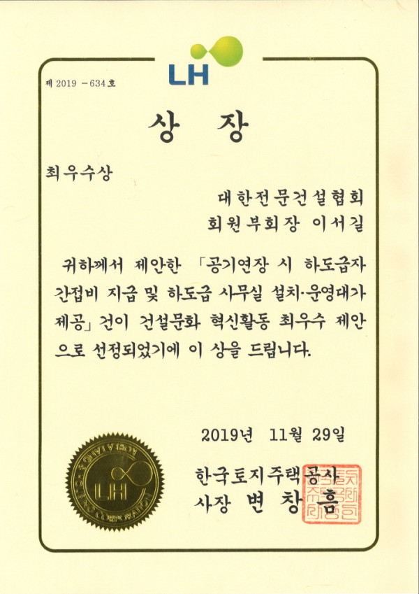 이서길 회장 LH공사 최우수 제안상 수상 페이지 정보 작성자 문찬주 댓글 0건 조회 695회 작성일 19-12-04 16:15 목록 본문 이서길 회장님께서 제안하신 "공기연장 시 하도급자 간접비 지급 및 하도급 사무실 설치.운영대가 제공"건이 한국토지주택공사에서 실시된 건설문화 혁신활동의 최우수 제안으로 선정되어 표창을 받으셨습니다.