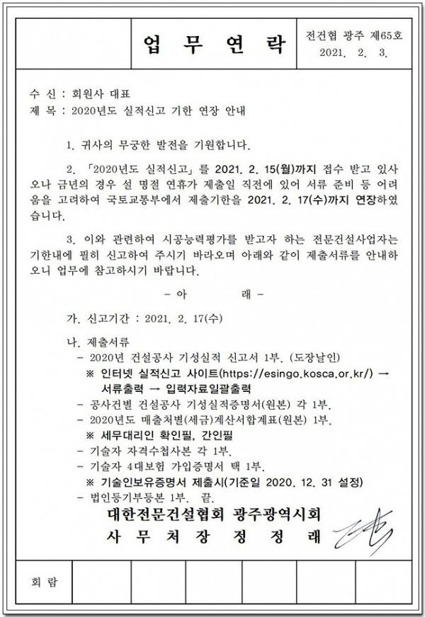HOME > 회원전용공간 > 2020년도 실적신고 기한 연장 안내 > 공지사항