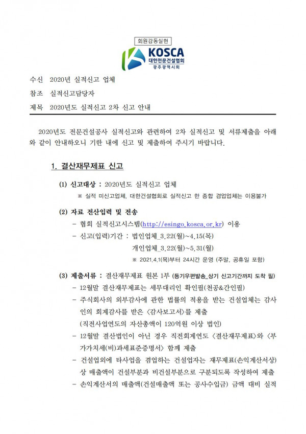 HOME > 회원전용공간 > 2020년도 실적신고 2차 서류 제출안내 > 공지사항