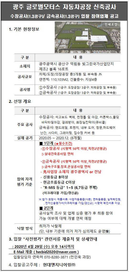 광주글로벌모터스 자동차공장 입찰참여안내(실내건축,금속창호)
