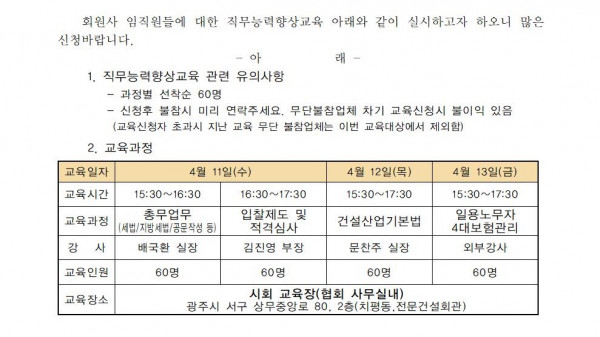 회원사 임직원 직무능력향상교육 실시 안내 페이지 정보 작성자 박진영 댓글 0건 조회 5,102회 작성일 2018-03-27 18:13 목록 본문 신청은 첨부된 공문을 참조하십시오. 첨부파일 b0e3454b_제118호_-_회원사_임직원_직무능력향상교육_실시_안내.pdf (100byte) 557회 다운로드 | DATE : 2018-03-27 18:13:00