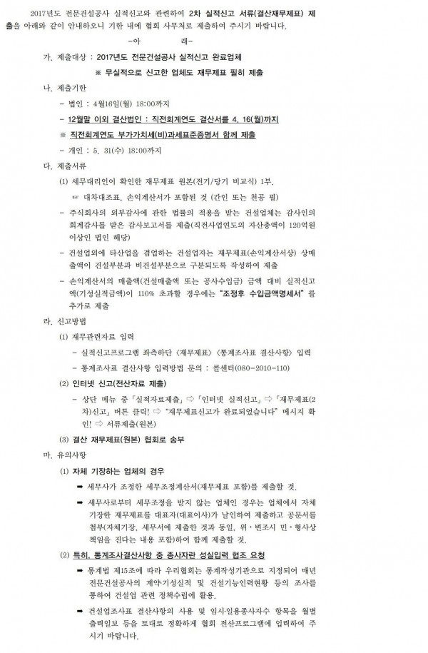 2017년도 전문건설공사 실적신고 안내