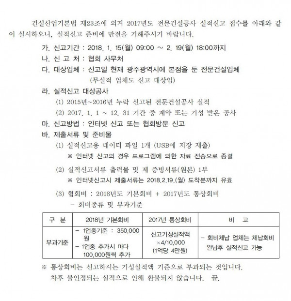 2017년 전문건설공사 실적신고 안내 페이지 정보 공문번호 : 전건협광주 제457호 담당직원 : 문찬주 문의전화 : T.062-380-2580 댓글 0건 조회 4,631회 작성일 2017-12-04 17:27 목록 본문 첨부파일 eb9f1070_제457호_-_2017년_전문건설공사_실적신고_안내(회원사).pdf (104byte) 90회 다운로드 | DATE : 2017-12-04 17:27:41