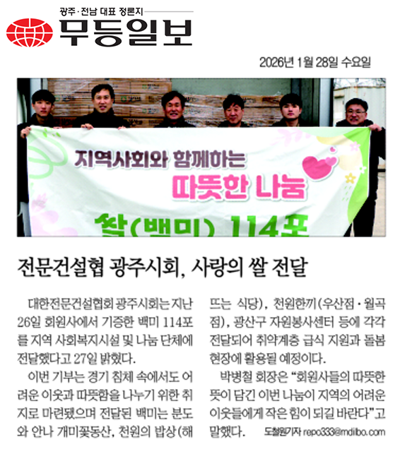 HOME > KOSCA광주 소개 > 전문건설협 광주시회, 사랑의 쌀 전달 (무등일보) > 보도자료
