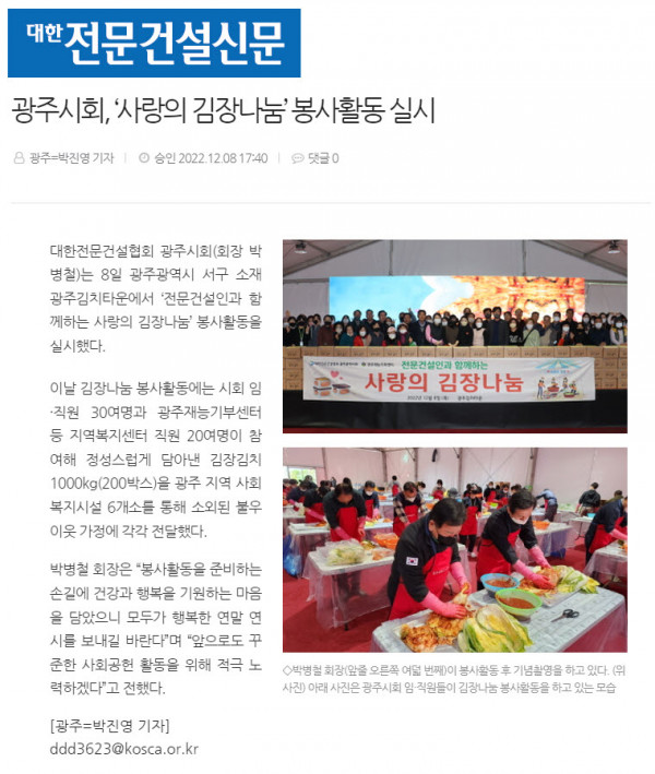 광주시회, '사랑의 김장나눔' 봉사활동 실시(대한전문건설신문)