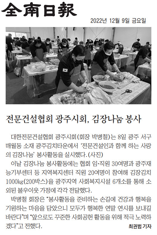 광주시회, '사랑의 김장나눔' 봉사활동 실시(대한전문건설신문)
