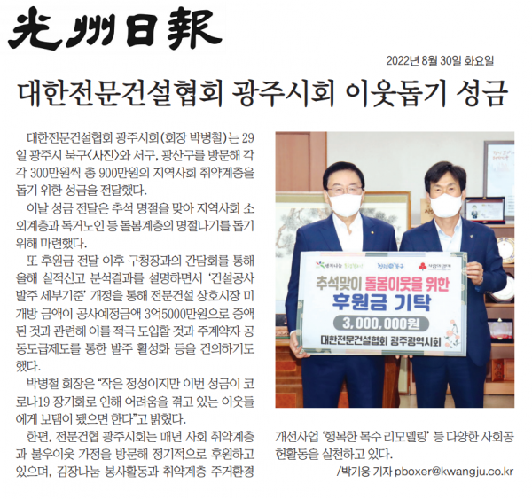 대한전문건설협회 광주시회 이웃돕기 성금 (광주일보)