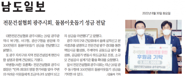전문건설협회 광주시회, 돌봄이웃돕기 성금 전달 (남도일보)