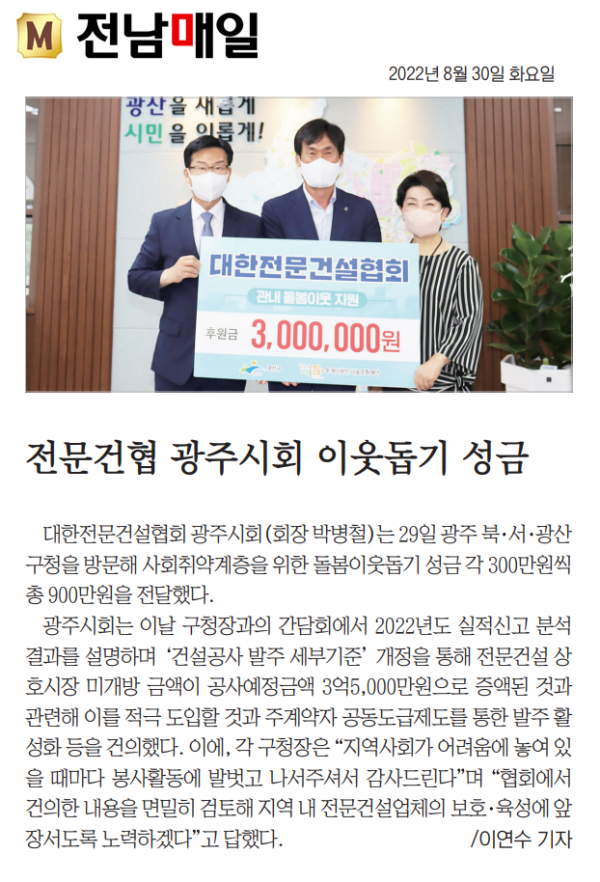 전문건설협회 광주시회, 돌봄이웃돕기 성금 전달 (남도일보)