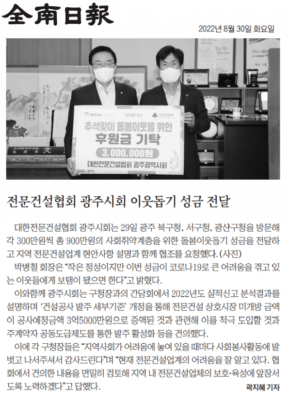 전문건설협회 광주시회, 돌봄이웃돕기 성금 전달 (남도일보)