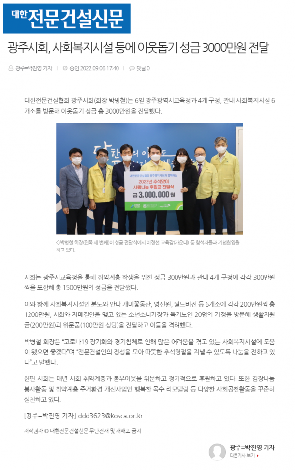 전문건설협회 광주시회, 이웃돕기 성금 3천만원 전달(무등일보)