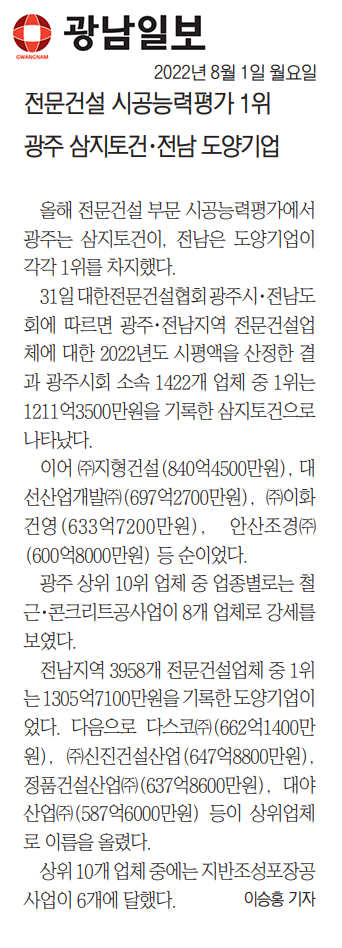 HOME > KOSCA광주 소개 > 전문건설 시공능력평가 1위 광주 삼지토건. 전남 도양기업 (광남일보) > 보도자료