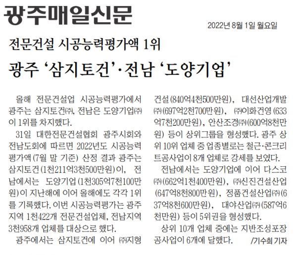 HOME > KOSCA광주 소개 > 전문건설 시공능력평가액 1위 광주\'삼지토건. 전남\'도양기업\' (광주매일신 > 보도자료