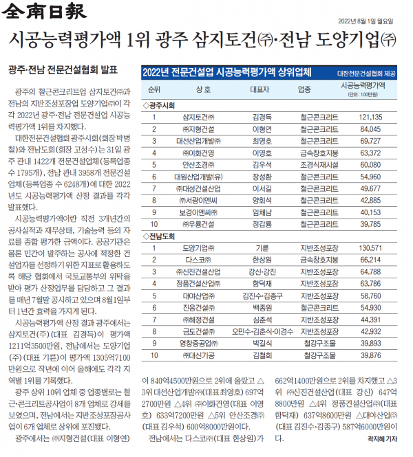 전문건설 '시평액', 광주 삼지토건. 전남 도양기업 1위 (남도일보)