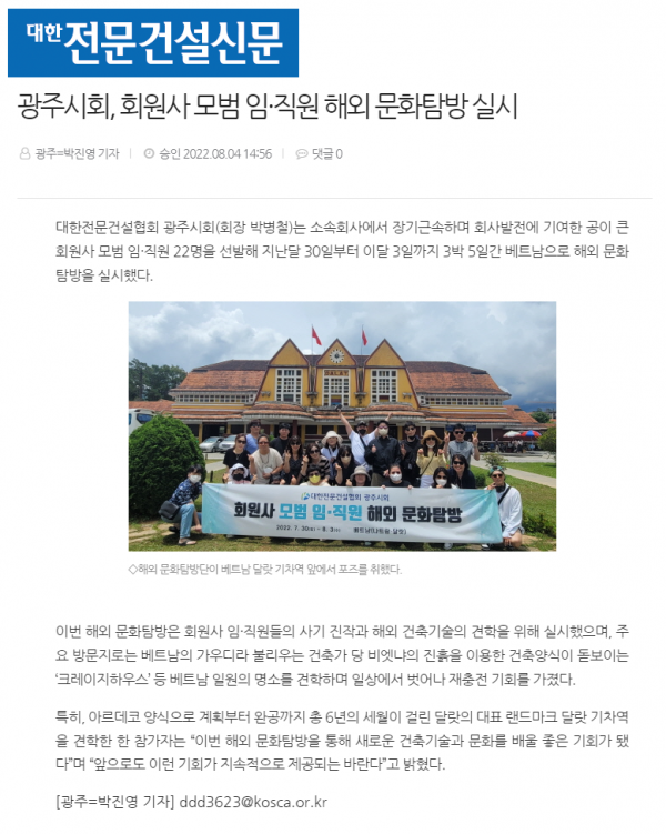 광주시회, 회원사 모범 임·직원 해외 문화탐방 실시(대한전문건설신문)