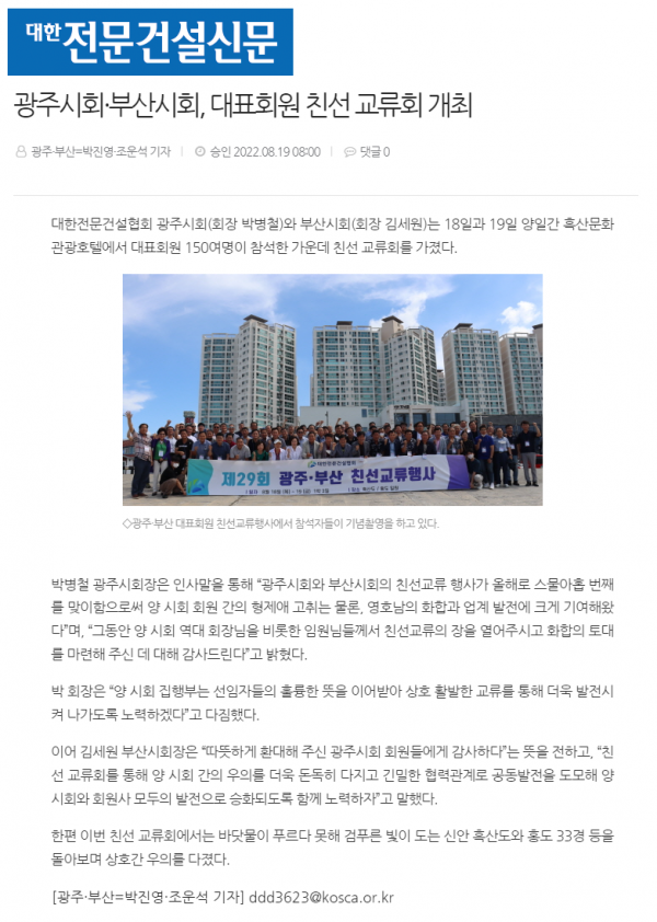 광주시회·부산시회, 대표회원 친선 교류회 개최(대한전문건설신문)