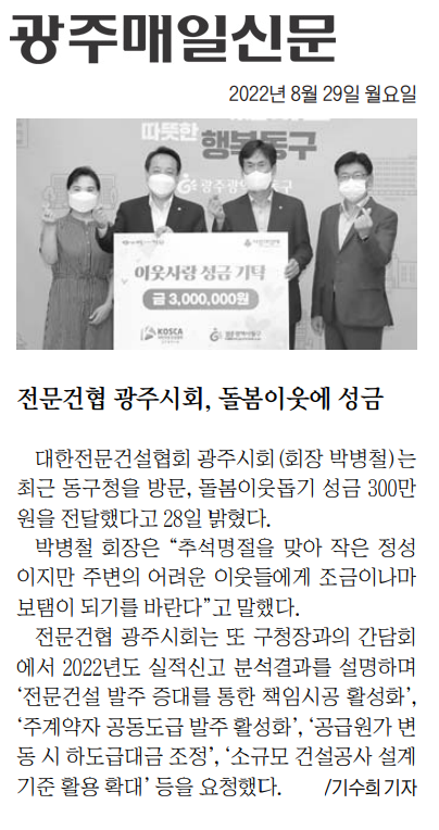 HOME > KOSCA광주 소개 > 전문건협 광주시회, 돌봄이웃에 성금 (광주매일신문) > 보도자료