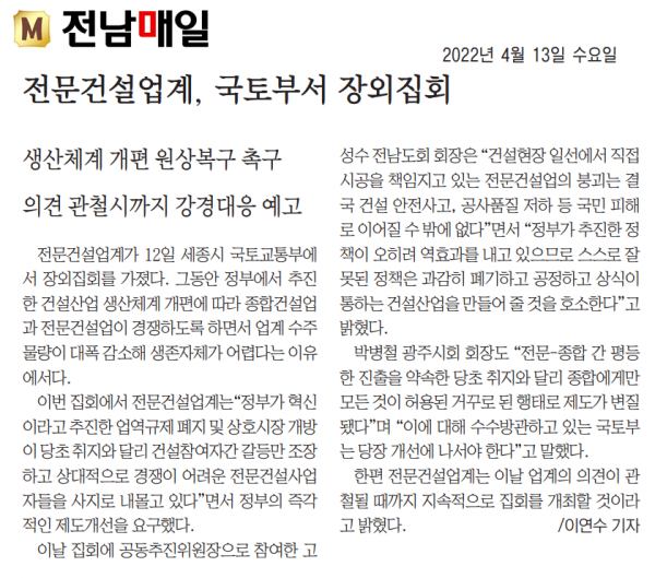 전문건설업계, 국토부서 장외집회 (전남매일신문)