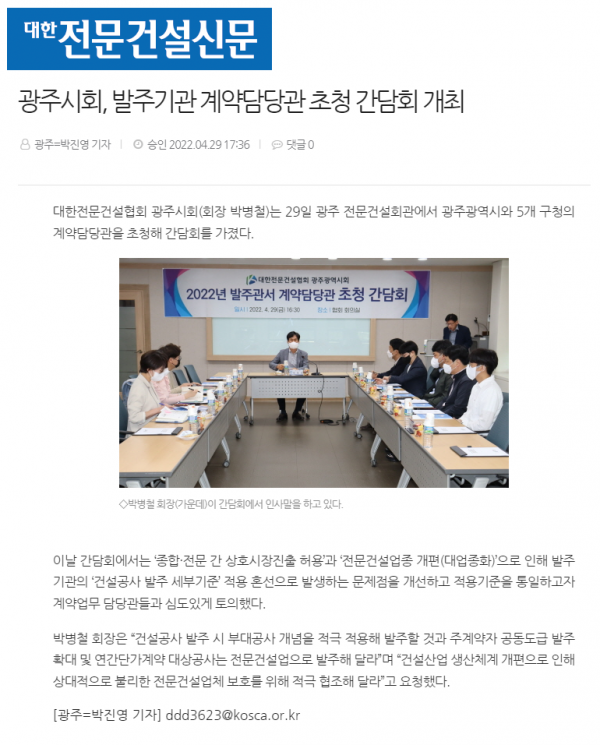 광주시회, 발주기관 계약담당관 초청 간담회 개최(대한전문건설신문)