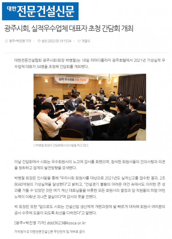 광주시회, 실적우수업체 대표자 초청 간담회 개최 (대한전문건설신문)