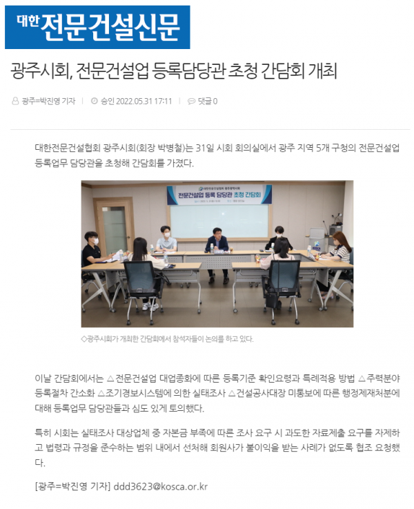 광주시회, 전문건설업 등록담당관 초청 간담회 개최(대한전문건설신문)