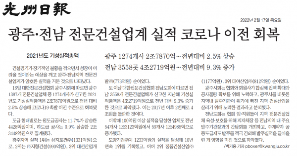 광주.전남 전문건설업계 실적 코로나 이전 회복 (광주일보)