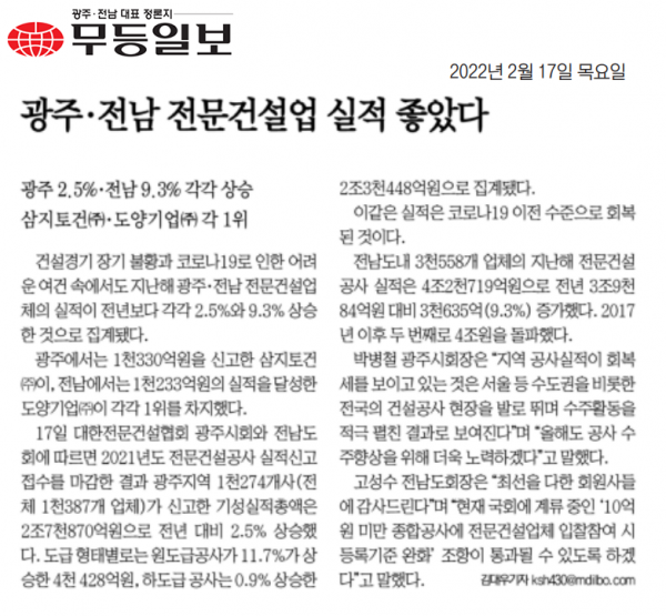 광주.전남 전문건설업 실적 좋았다 (무등일보)