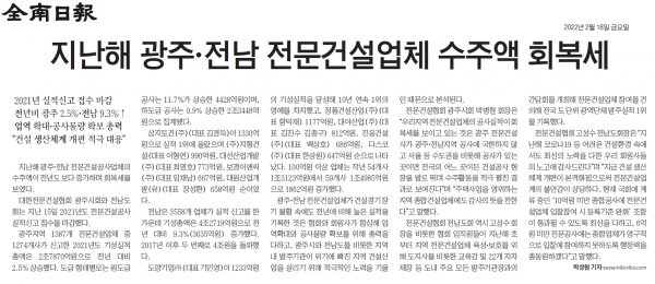 광주.전남 전문건설업 실적 좋았다 (무등일보)