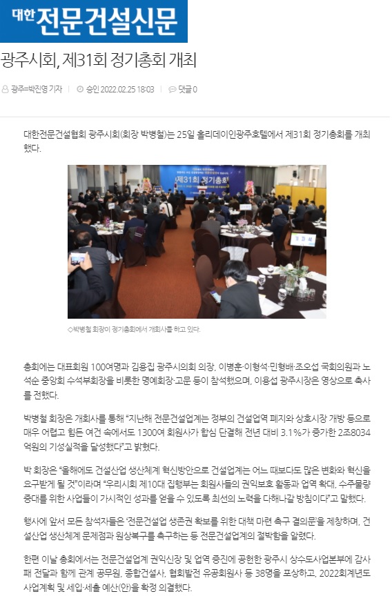 광주시회, 제31회정기총회 개최 (대한전문건설신문)