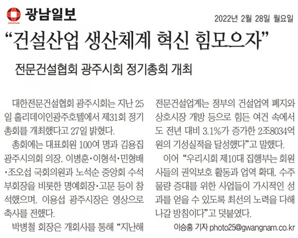 "건설산업 생산체계 혁신 힘모으자" 광주시회 정기총회 개최 (광남일보)