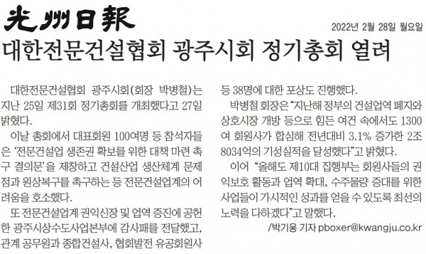 광주시회, 제31회정기총회 개최 (대한전문건설신문)