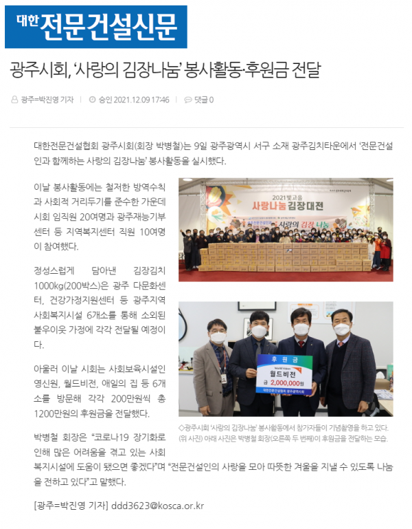 HOME > KOSCA광주 소개 > 광주시회, ‘사랑의 김장나눔’ 봉사활동·후원금 전달 (대한전문건설신문) > 보도자료