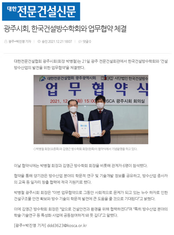 광주시회, 한국건설방수학회와 업무협약 체결 (대한전문건설신문)
