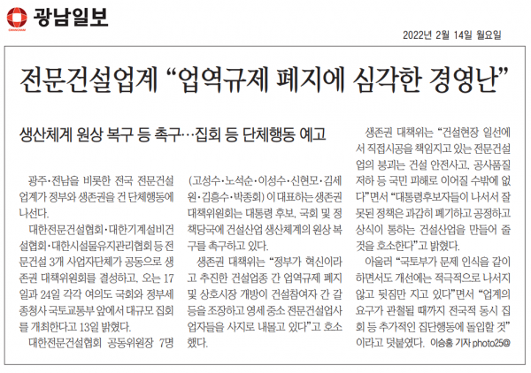 전문건설업계"업역규제 폐지에 심각한 경영난" (광남일보)
