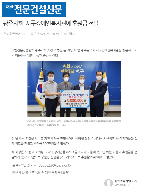 광주시회, 서구장애인복지관에 후원금 전달 (대한전문건설신문)
