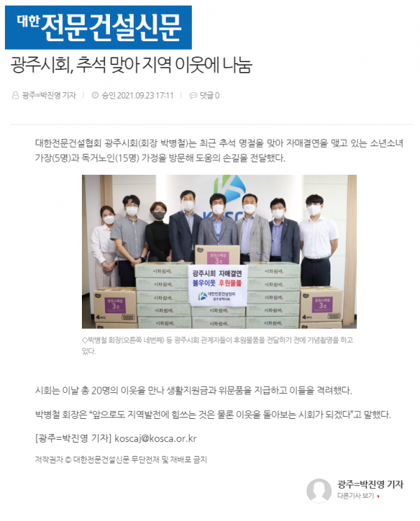 광주시회, 추석 맞아 지역 이웃에 나눔 (대한전문건설신문)