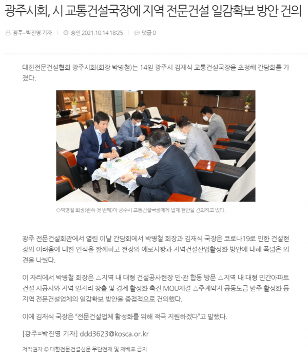 HOME > KOSCA광주 소개 > 광주시회, 시 교통건설국장에 지역 전문건설 일감확보 방안 건의(전문건설신 > 보도자료
