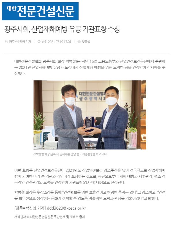 광주시회, 산업재해예방 유공 기관표창 수상 (대한전문건설신문)