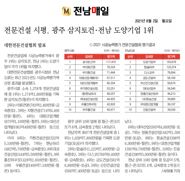 광주 삼지토건. 전남 도양기업, 시공능력 1위 (무등일보)