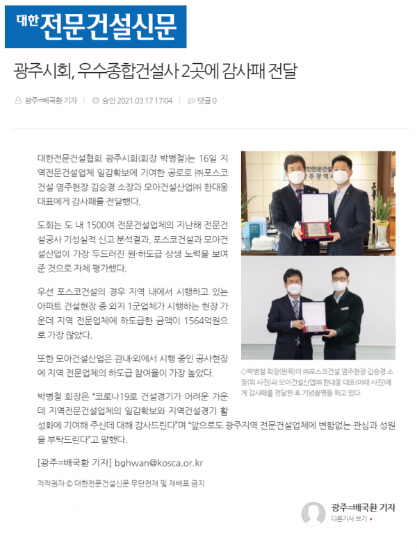 광주시회, 우수종합건설사 2곳에 감사패 전달 (대한전문건설신문)