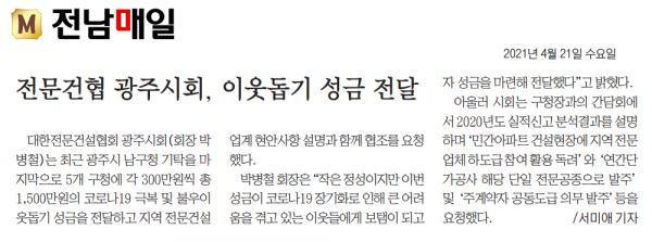전문건설협 광주시회, 이웃돕기 성금 전달(광주매일신문)