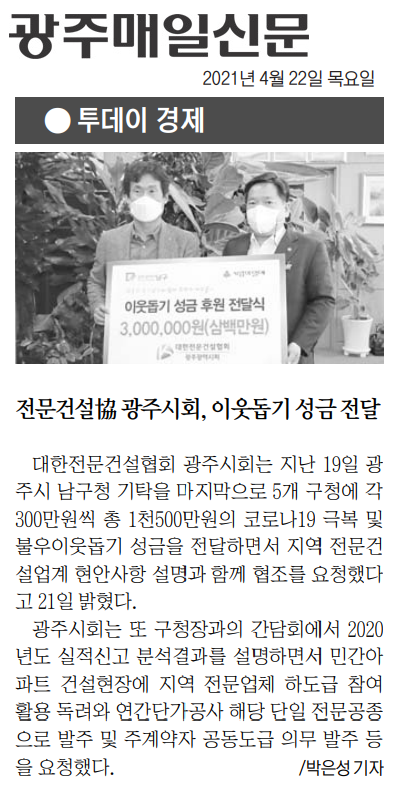 전문건설협 광주시회, 이웃돕기 성금 전달(광주매일신문)