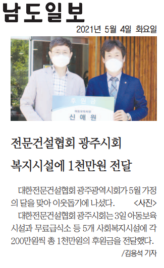 HOME > KOSCA광주 소개 > 전문건설협회 광주시회 복지시설에 1천만원 전달(남도일보) > 보도자료