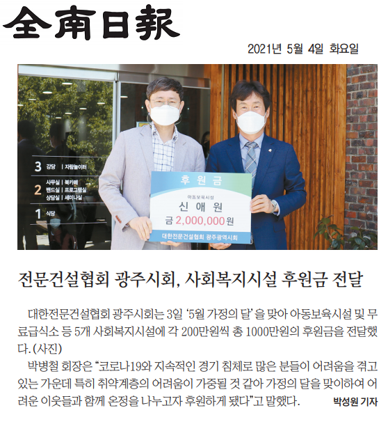 광주시회,'가정의 달'맞아 사회복지시설 5곳에 후원금 전달(전문건설신문)