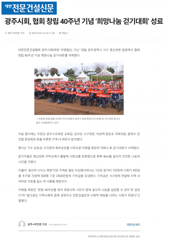 광주시회, 협회 창립 40주년 기념 ‘희망나눔 걷기대회’ 성료 (대한전문건설신문) 페이지 정보 작성자 전문건설협회광주광역시회 댓글 0건 조회 844회 작성일 2025-10-21 10:27 목록 본문