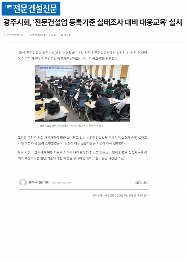 광주시회, ‘전문건설업 등록기준 실태조사 대비 대응교육’ 실시(대한전문건설신문) 페이지 정보 작성자 전문건설협회광주광역시회 댓글 0건 조회 649회 작성일 2025-11-12 10:43 목록 본문