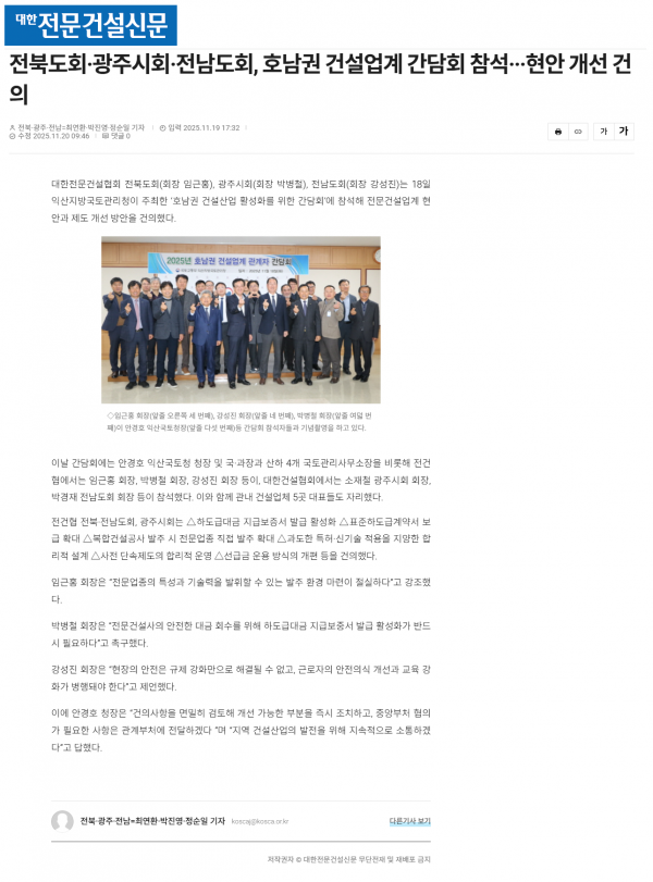 전북도회·광주시회·전남도회, 호남권 건설업계 간담회 참석···현안 개선 건의(대한전문건설신문) 페이지 정보 작성자 전문건설협회광주광역시회 댓글 0건 조회 813회 작성일 2025-11-20 11:48 목록 본문