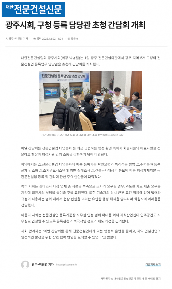 광주시회, 구청 등록 담당관 초청 간담회 개최(대한전문건설신문)