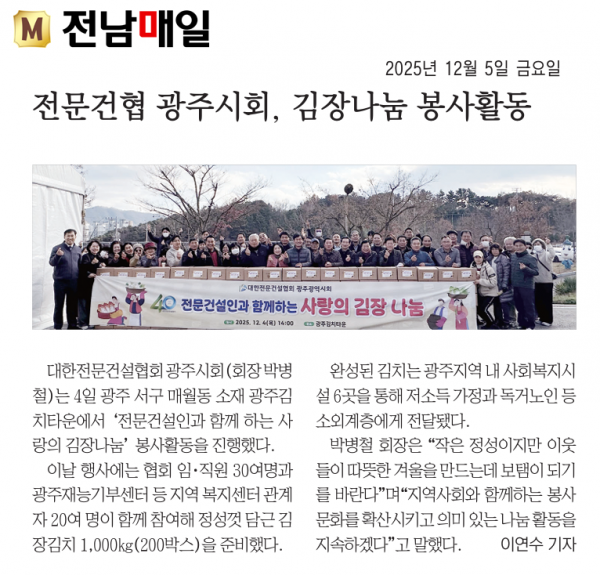 HOME > KOSCA광주 소개 > 전문건협 광주시회, 김장나눔 봉사활동 (전남매일) > 보도자료