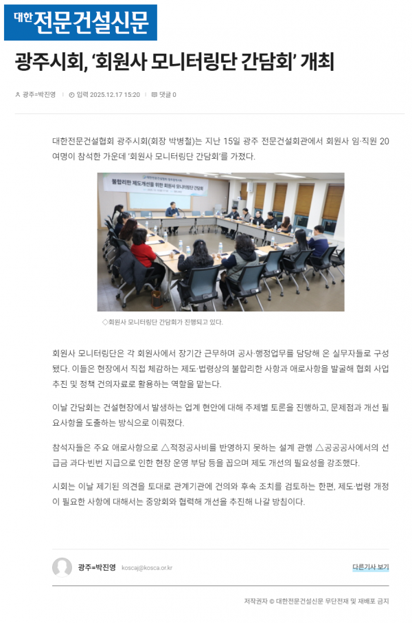 광주시회, ‘회원사 모니터링단 간담회’ 개최 (대한전문건설신문)
